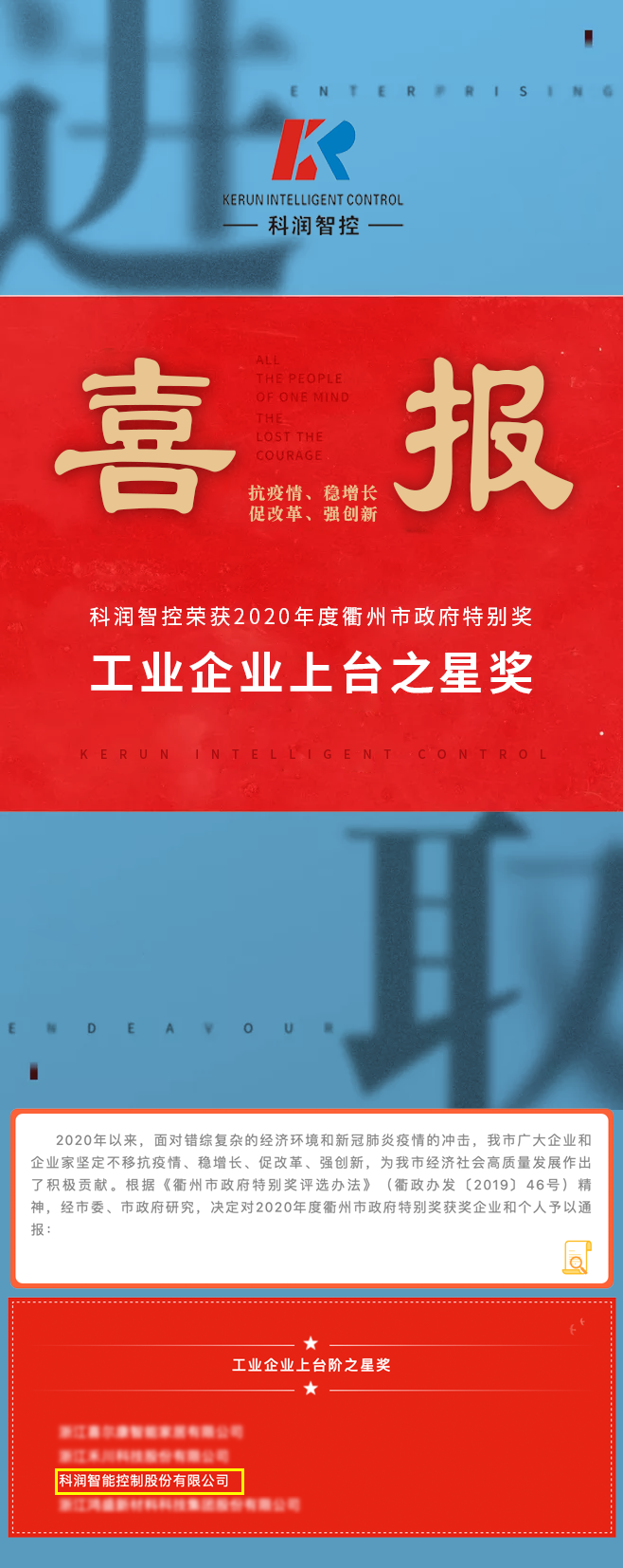 優秀!科潤智控榮獲2020年度衢州市政府特別獎!!!