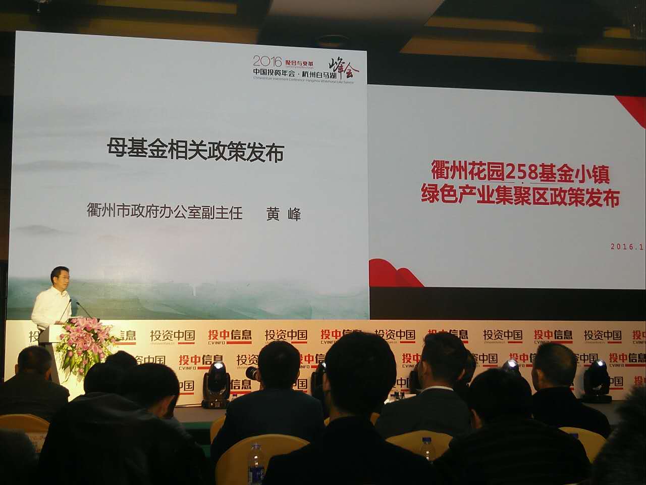 11月23日至24日,2016聚合與變革·中國投資年會·杭州白馬湖峰會在杭州召開。江山市副市長巫小雄率隊參加峰會,公司總經理章群峰參加,并與相關投資公司進行意向對接 。