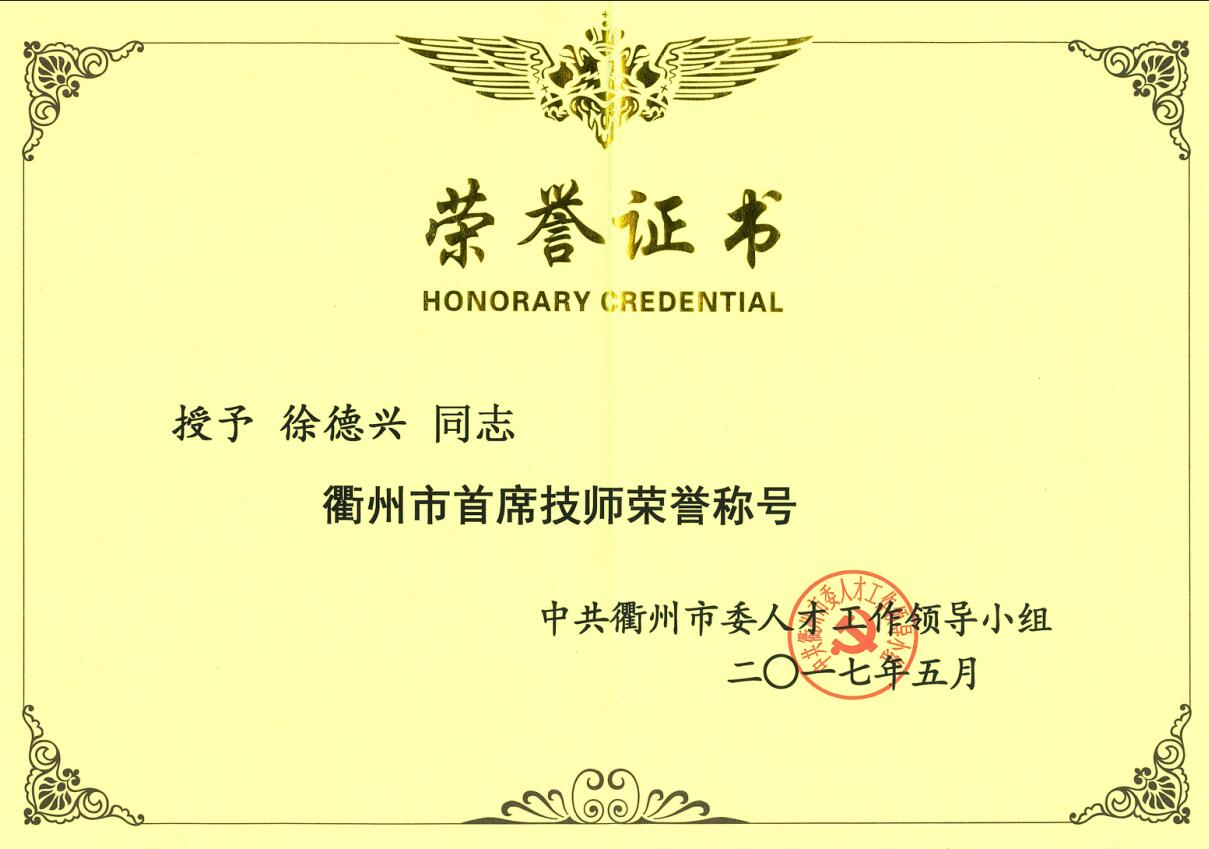 喜訊:我司員工徐德興獲“衢州市首席技師榮譽稱號”。
