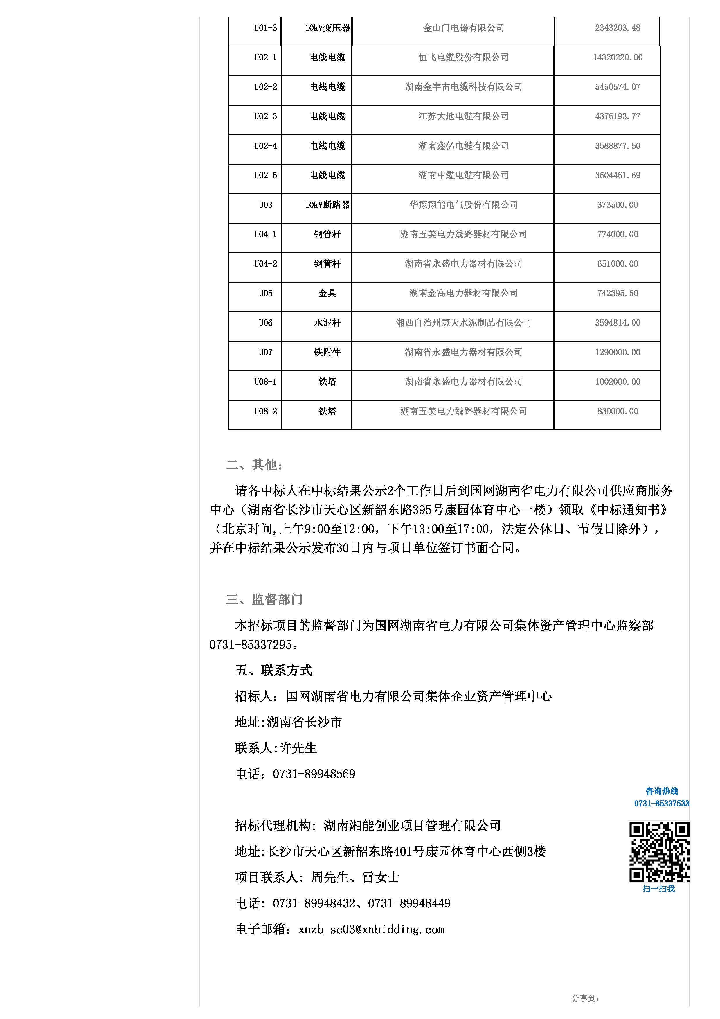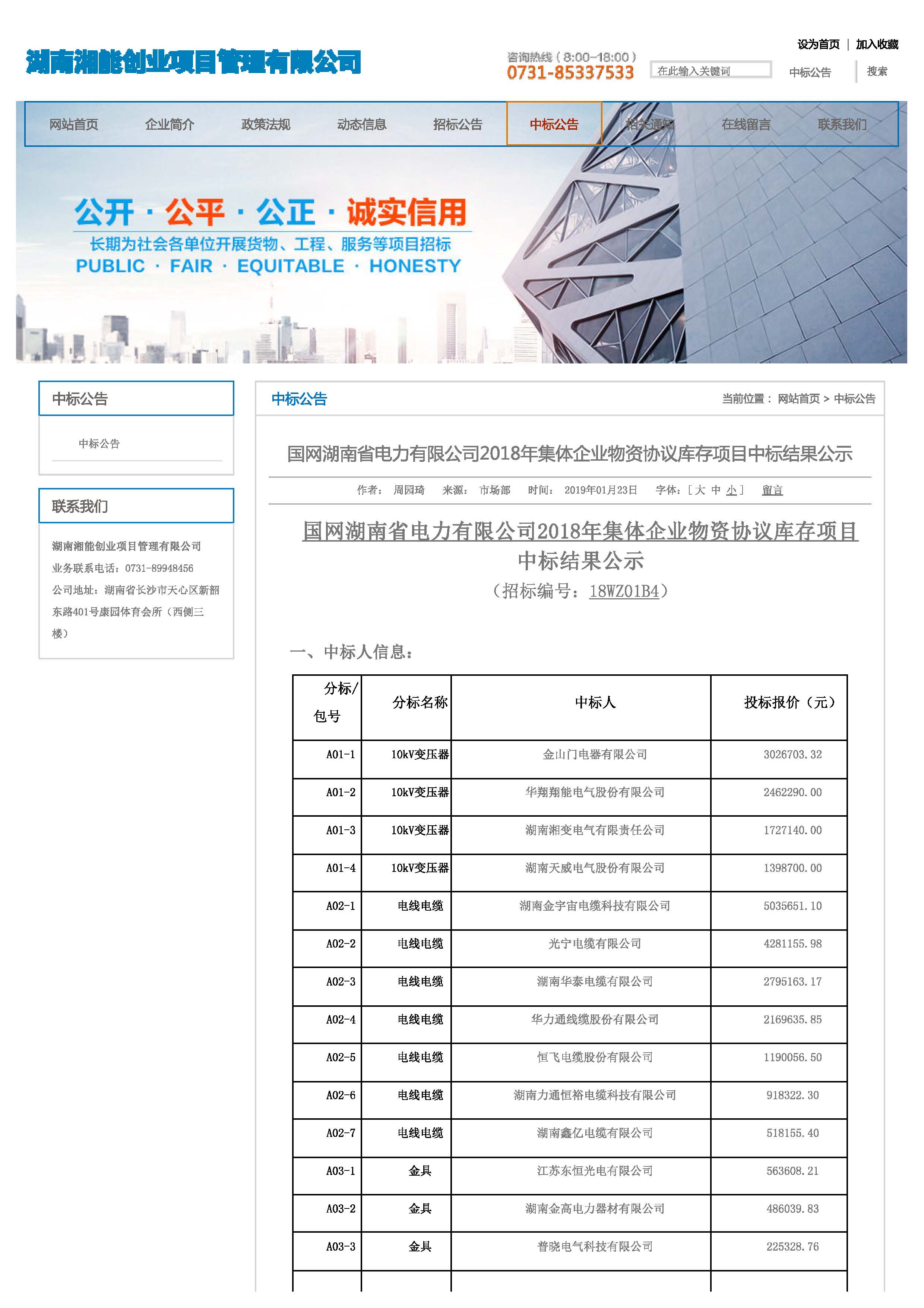 1、國網湖南省電力有限公司2018年集體企業物資協議庫存項目,中標金額:16882781.52元。