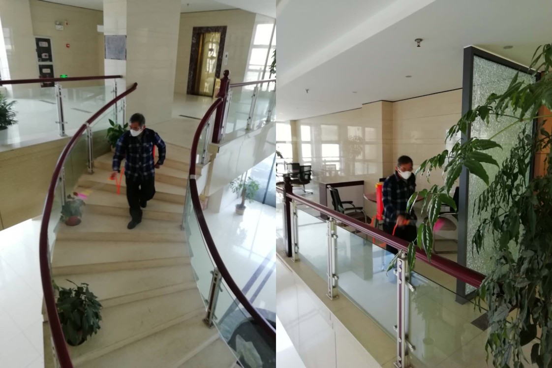 2020年2月9日上午,公司老黨員樂田光同志積極發揮黨員模范先鋒作用,用84消毒液對三個事業部的生產區域、辦公大樓、各辦公室、公共區域包括食堂、電梯、樓道、衛生間以及停車場和車輛等進行消毒,讓員工有個放心的工作環境,為復工保駕護航。